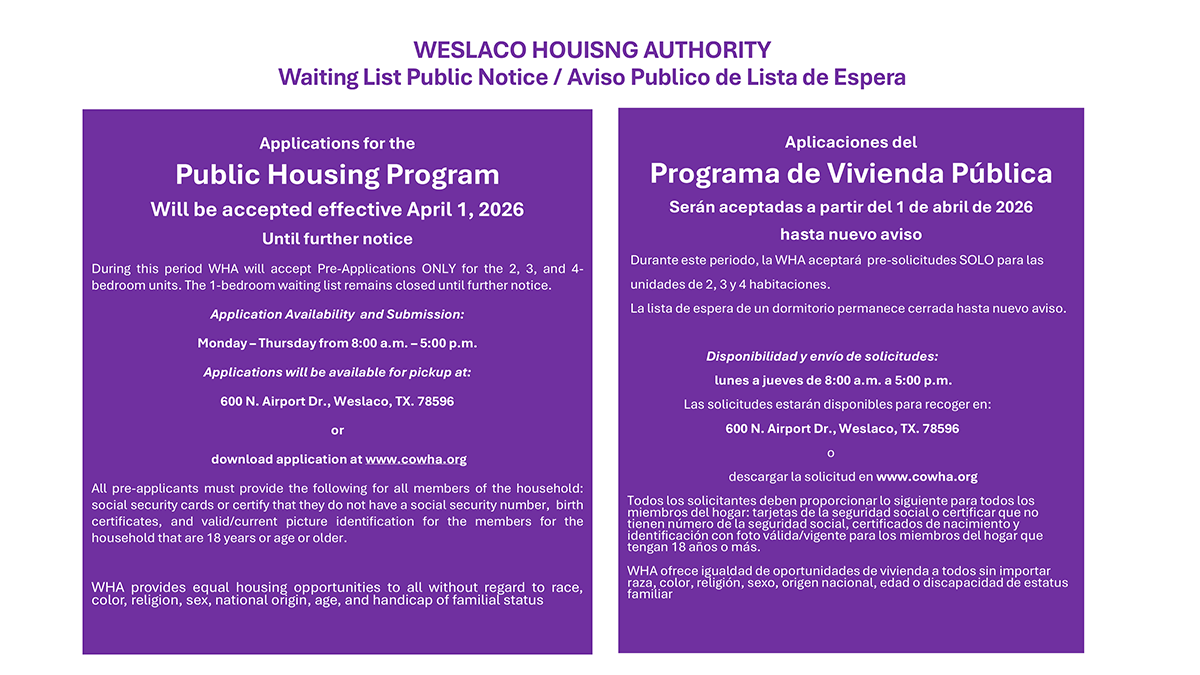 The Weslaco Housing Authority’s main focus is to assist residents to be successful and improve their economic stability. We provide information to our…
